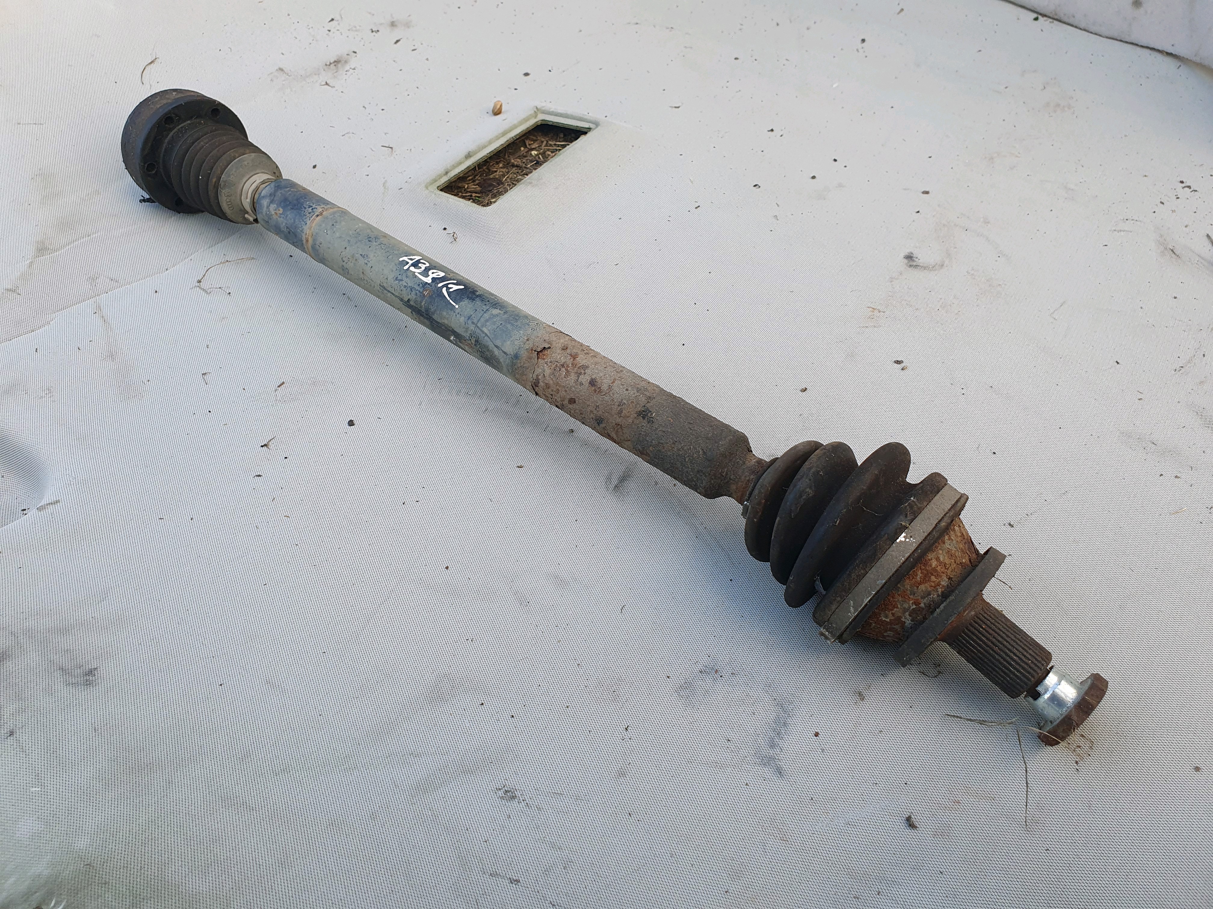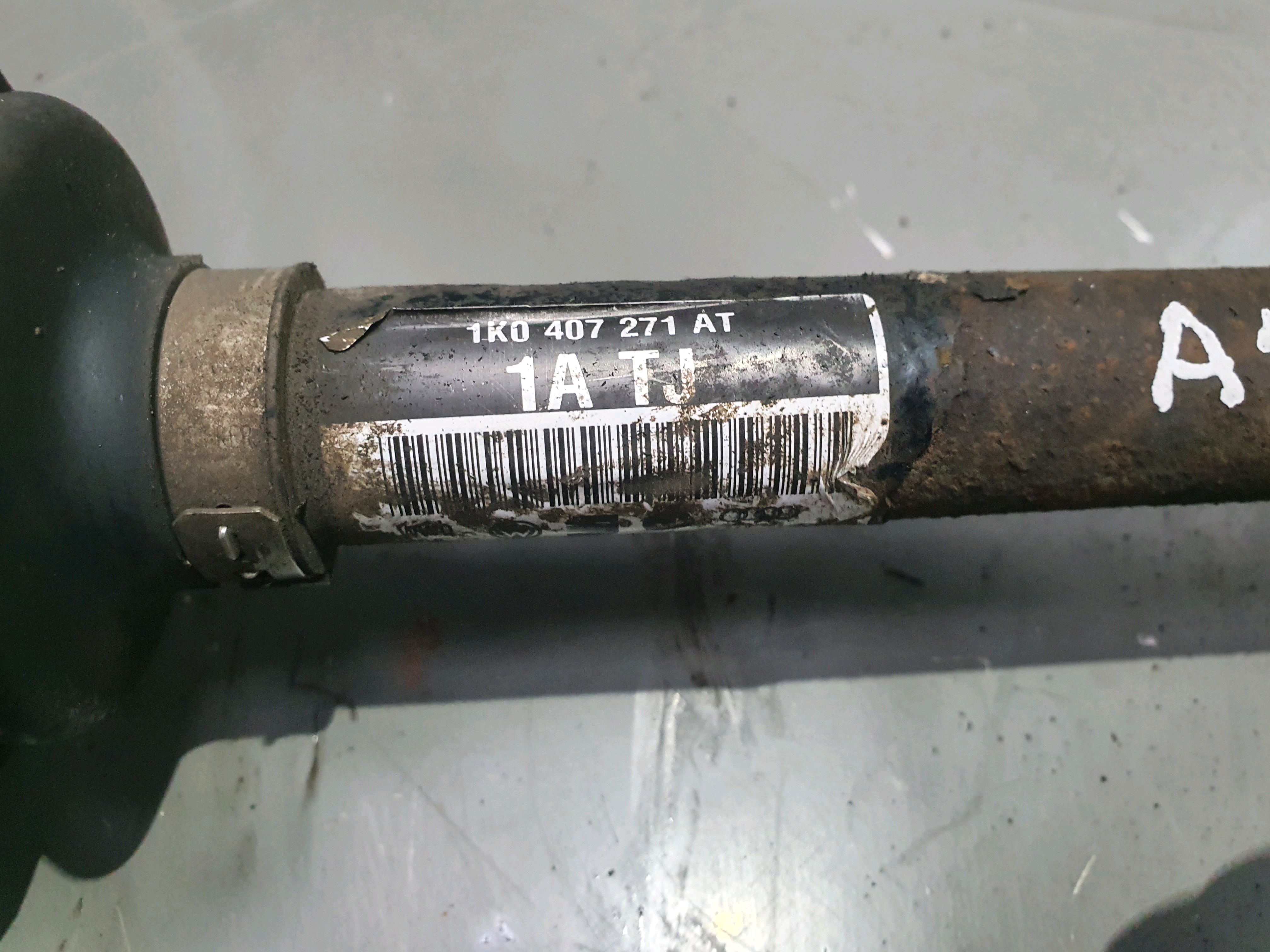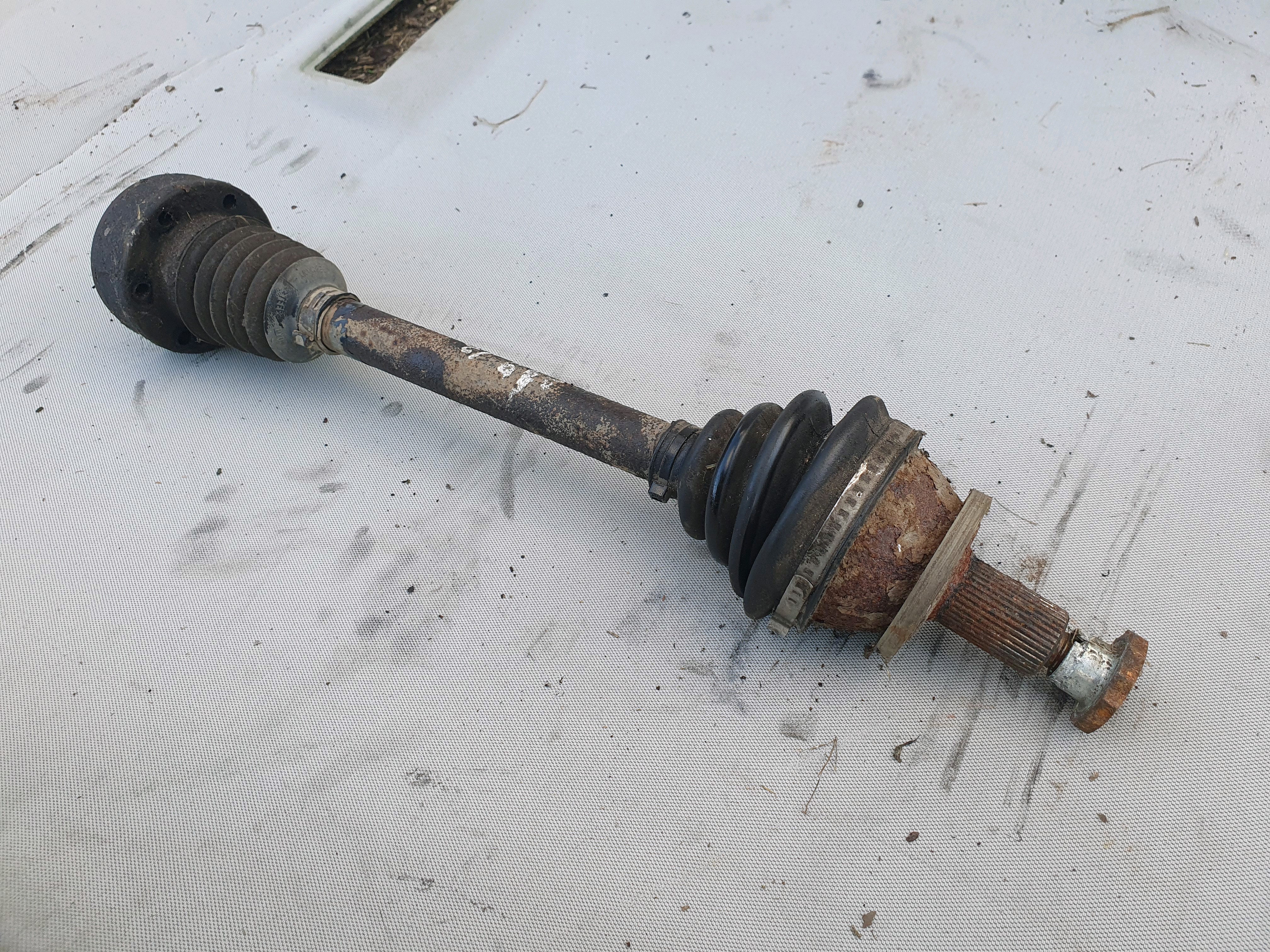 Front Driver OS Driveshaft removed from VW Jetta 1K5 MK3 (2006-2010). Fitment depends on engine. Please match part numbers and vehicle details. Note: Corrosion visible.